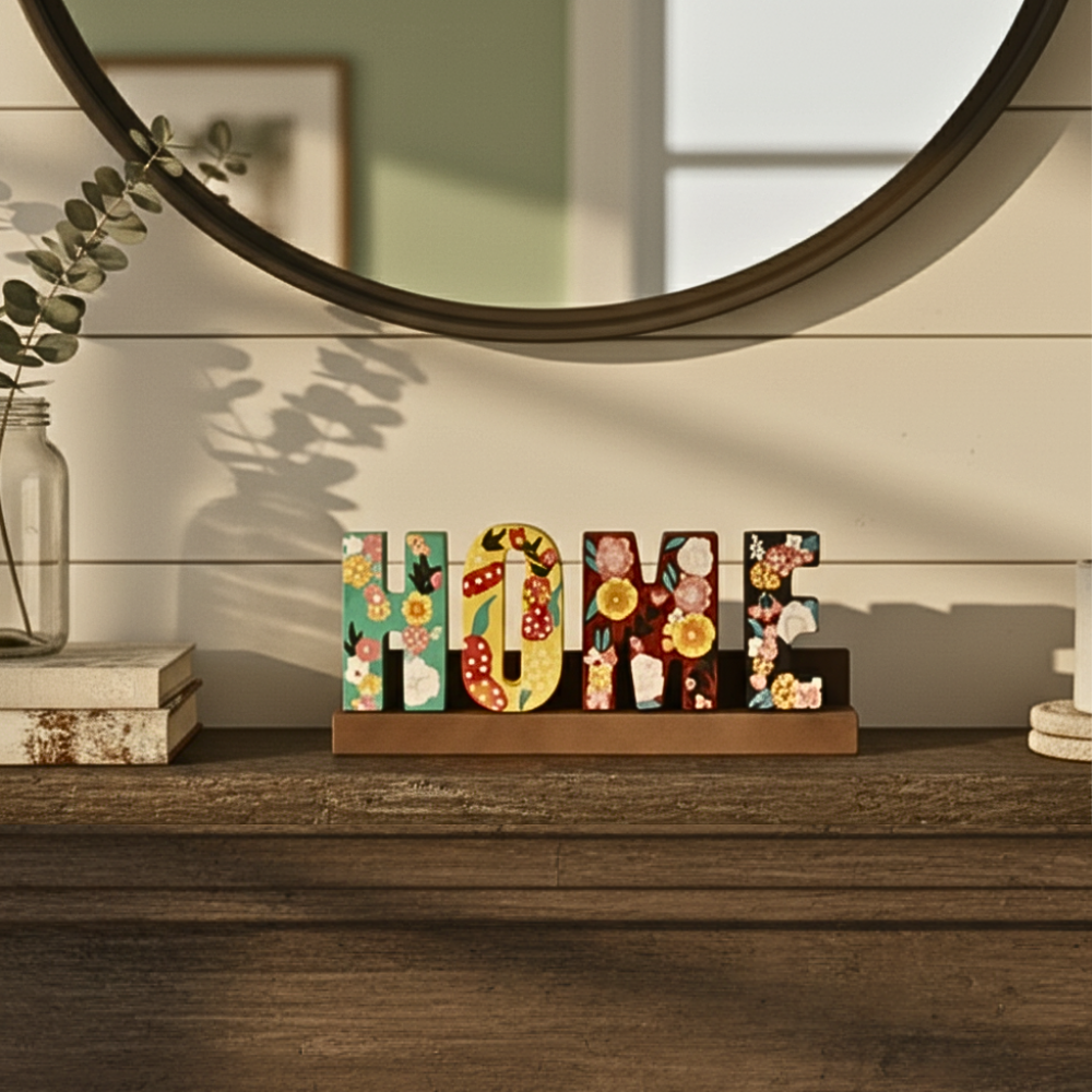 This vibrant home decor item features the word “HOME” in bold ceramic letters, each adorned with colorful floral artwork. Whether placed in your living room, library, bedroom, or gallery wall, it brings instant joy and a welcoming vibe.