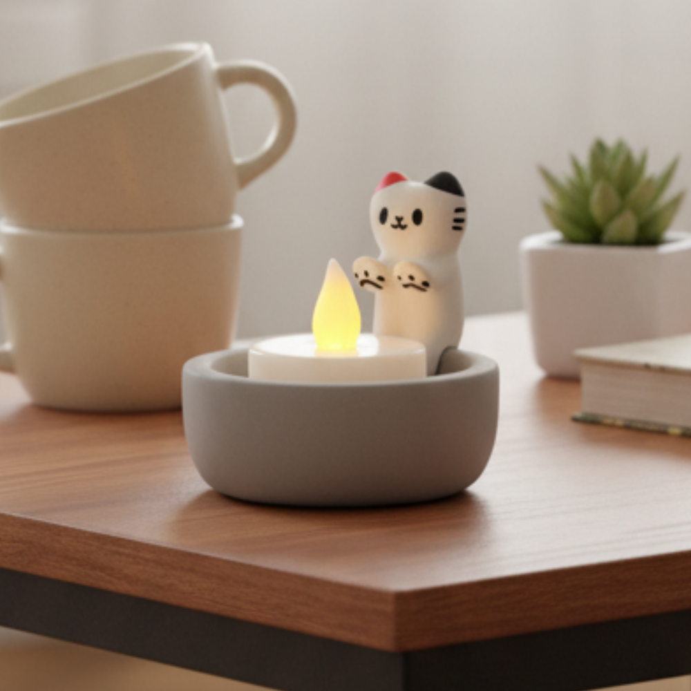 Add a touch of warmth and charm to your home with this Minimalist Cat Figurine Tea Light Holder. Beautifully handcrafted and hand-painted, this cat sculpture takes inspiration from the beloved lucky Maneki-Neko, giving it a playful yet elegant appeal. The neutral grey base complements modern and minimalist décor styles, making it a versatile decorative accent.