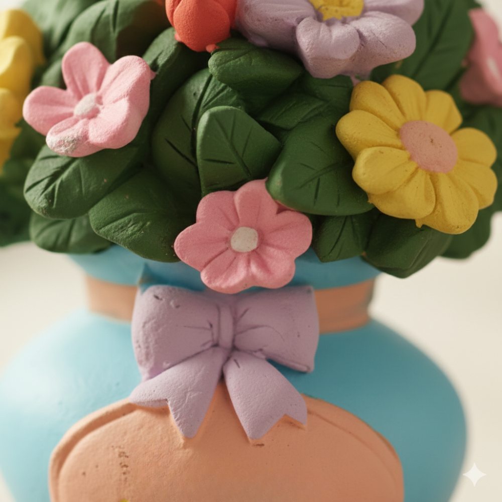 - Detailed Design: The light-blue vase is adorned with a decorative peach-colored plaque and a dainty purple ribbon bow, adding a touch of sweetness.